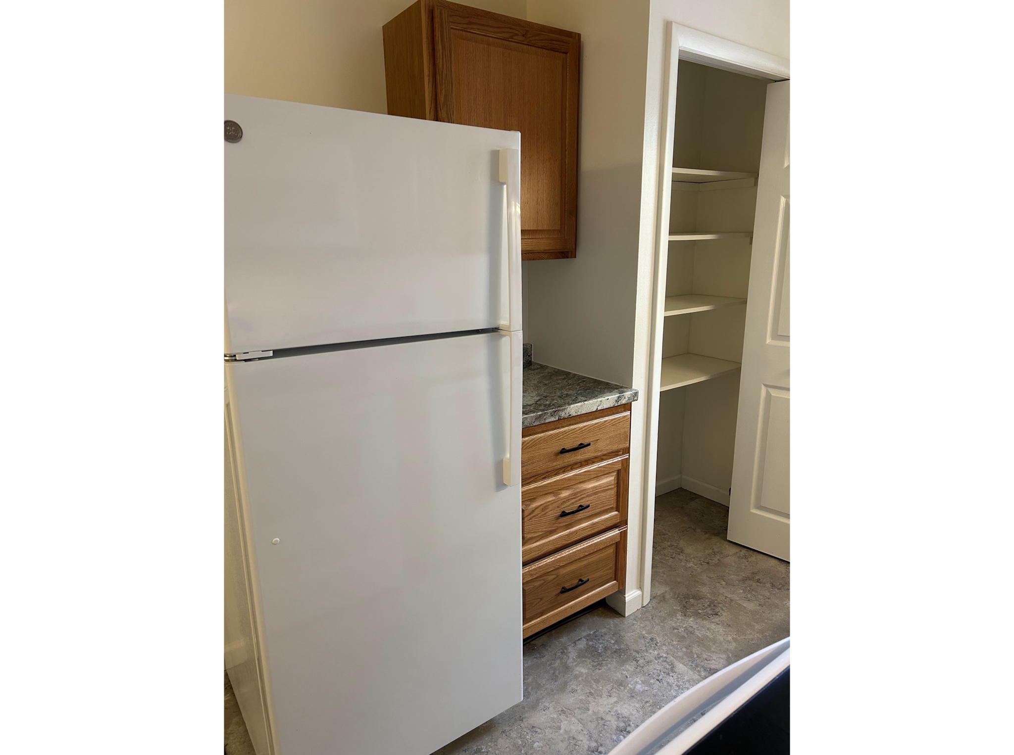 The galley kitchen is thoughtfully designed with newly updated cabinets, a pantry, and plenty of storage, and comes fully equipped with a refrigerator, range, over-the-range microwave, and dishwasher.